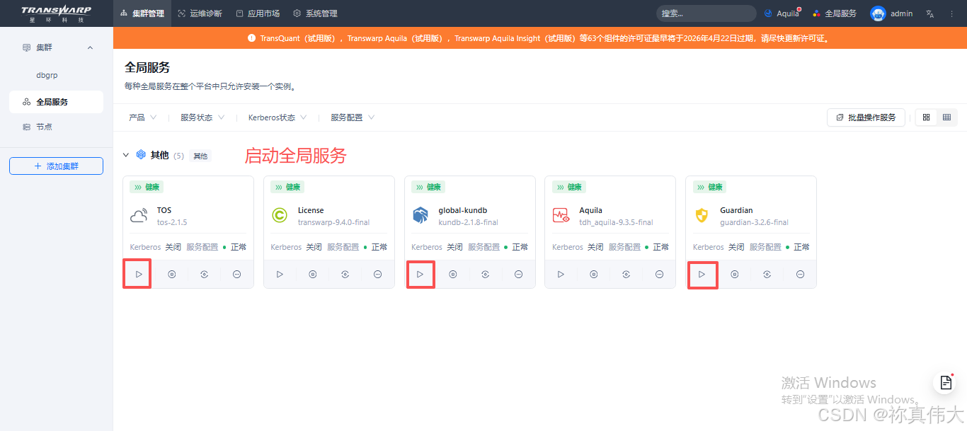 - 全局服务里面TOS、Guardian、Kundb 都要先启动