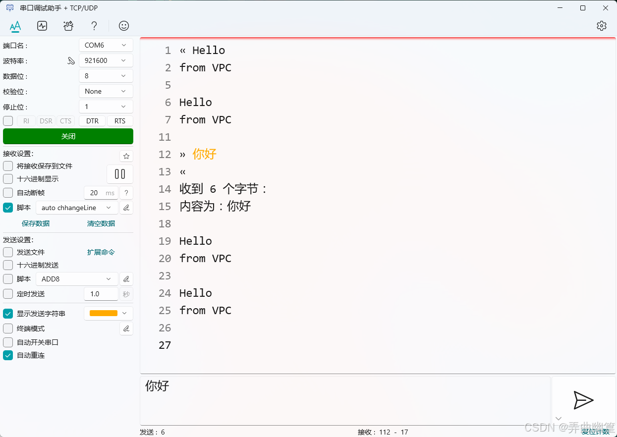 打开串口调试助手,可以看到可以定时收到数据了。如果不知道是哪个端口的话,随便插拔一下,看一下哪个端口消失了就能确定,波特率啥的都不用设置。