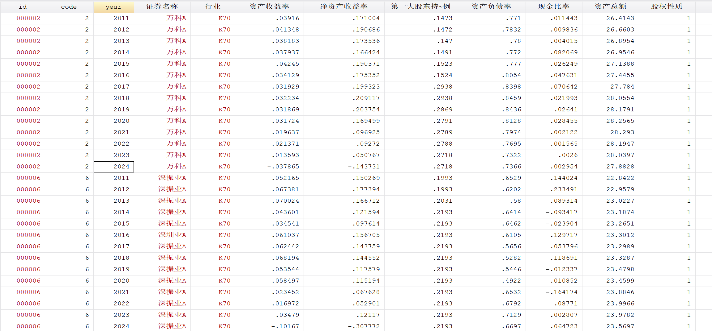 股票代码、年份、总资产SIZE、资产收益率ROE、净资产收益率ROE、资产负债率LEV、第一大股东持股比例、现金比率、股权性质(国企为1,非国企为0)等等。