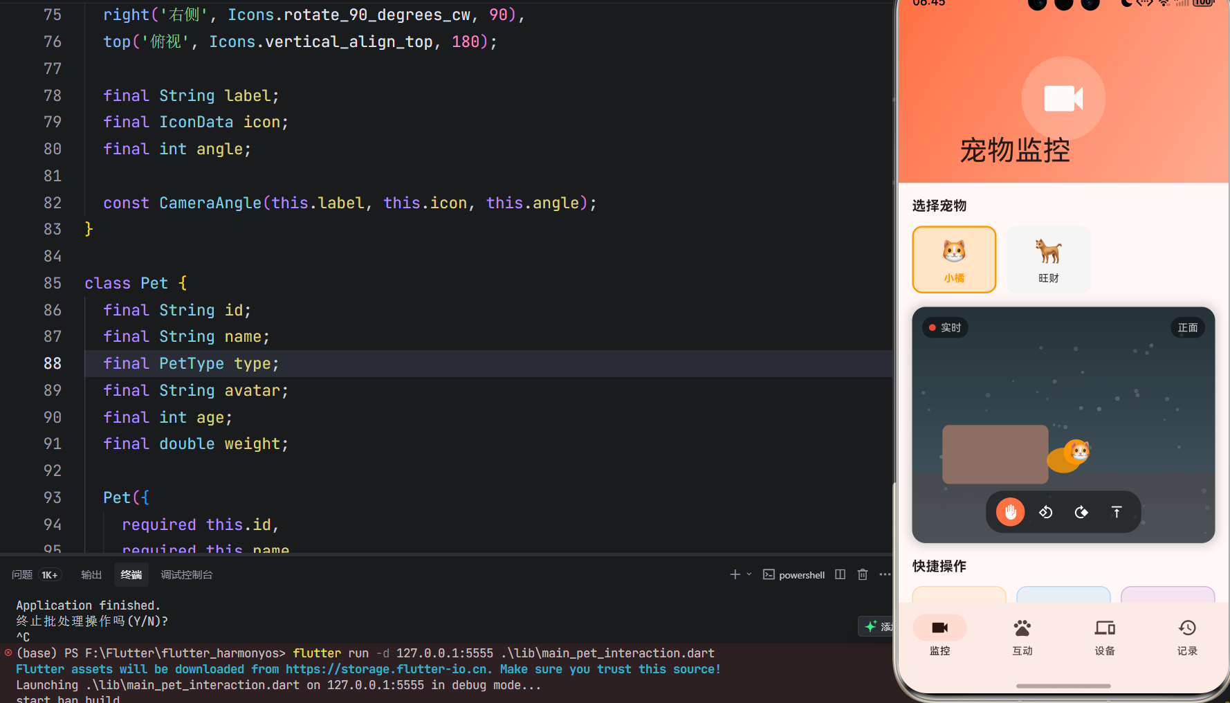 从技术实现来看,应用使用枚举类型定义5种宠物类型、5种互动类型、4种喂食器状态和4种摄像头角度,通过CustomPaint绘制模拟摄像头画面,使用Timer实现激光点的随机移动,通过GestureDetector实现激光位置的手动控制。