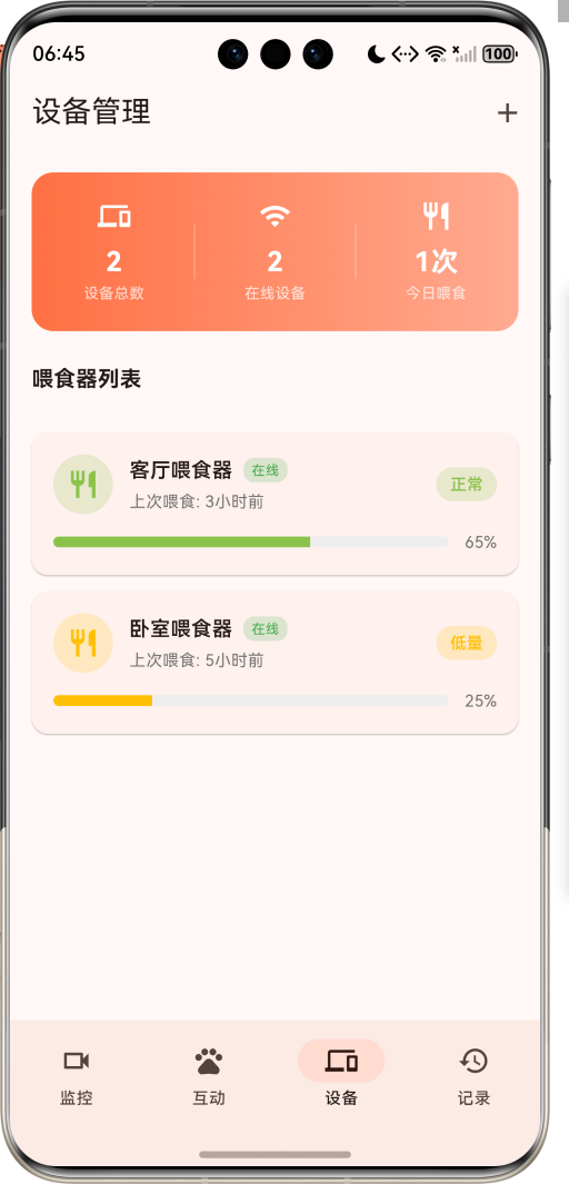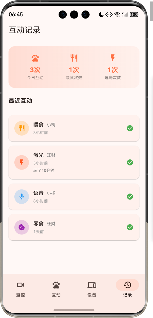 | 零食奖励 | 远程投喂零食 | 互动记录 |