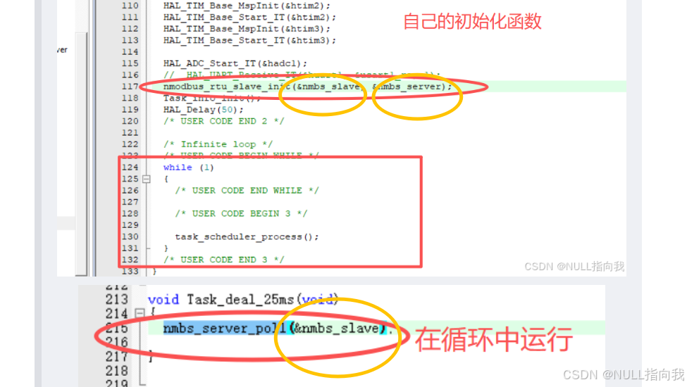 cppnmbs_t nmbs_slave; // 实例 nmbs_server_t nmbs_server = { .id = 0x02, .coils = { 0, }, .regs = { 0, }, };他们会在初始化函数以及poll中被调用