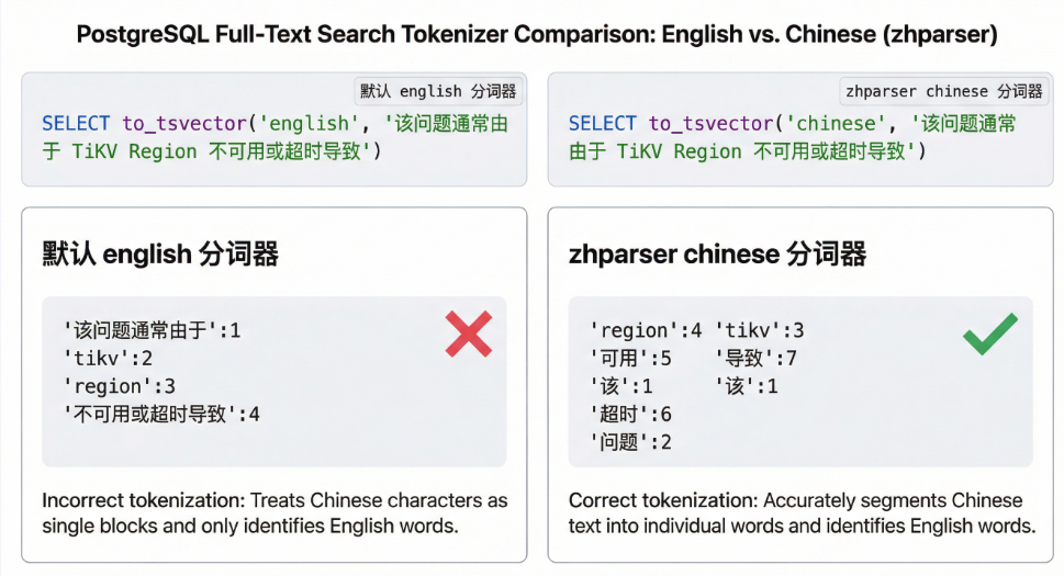 | 中文查询只能搜完整词,部分匹配不到 | tsquery 精确匹配分词结果 | 使用 chinese_compatible 或 jieba 分词器,支持更细粒度切分 |