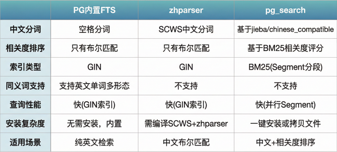在实际项目中,可以将多种方案组合使用:用 zhparser 或 pg_search 做中文全文检索,同时保留内置 FTS 处理英文场景,各取所长。