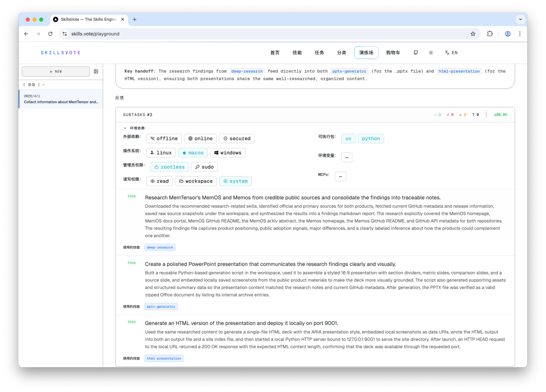 SkillsVote Playground 网页端,SUBTASKS #3 展示 3 个子任务全部 PASS,100% 成功率,每个子任务标注了使用的 skills 和详细执行摘要