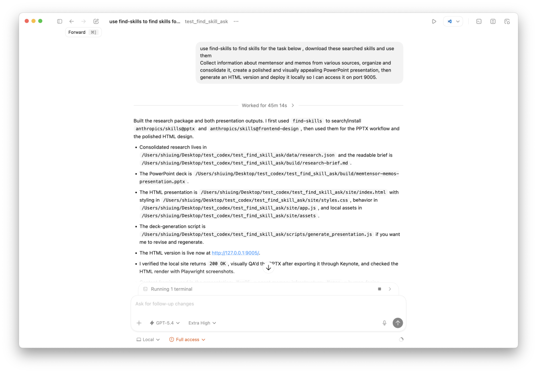 任务是这样的:"收集 MemTensor 和 Memos 的公开信息,整理成结构化内容,做一个精美的 PowerPoint 演示文稿,再生成一个 HTML 版本并本地部署到 9001 端口。"
