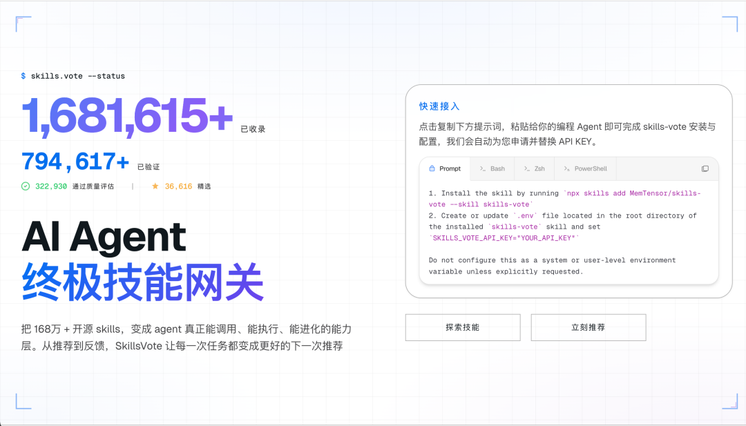SkillsVote 是目前唯一同时具备在线推荐、执行引导、反馈闭环三项能力的 Agent Skills 产品。