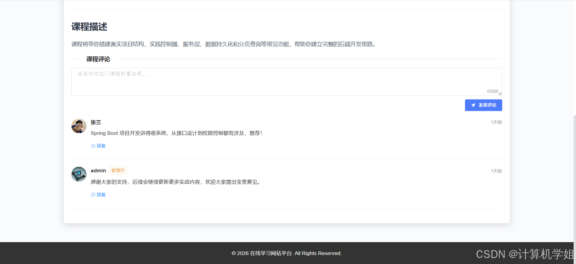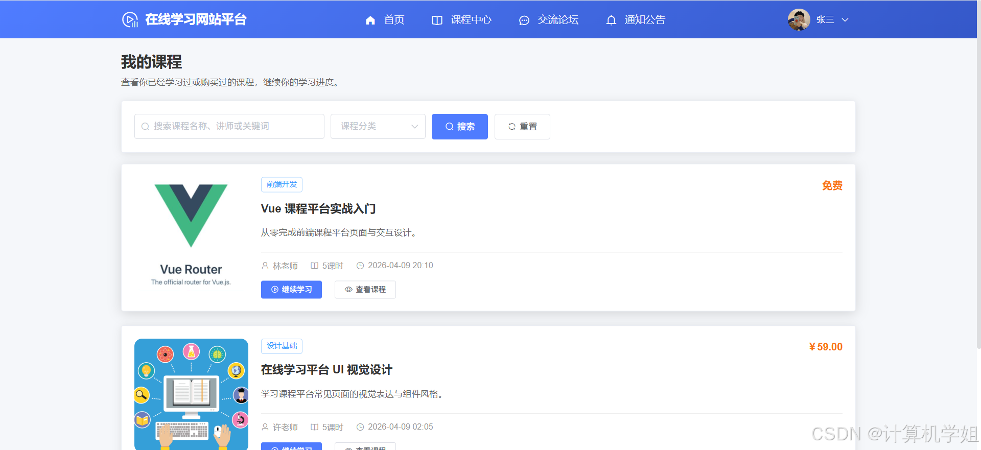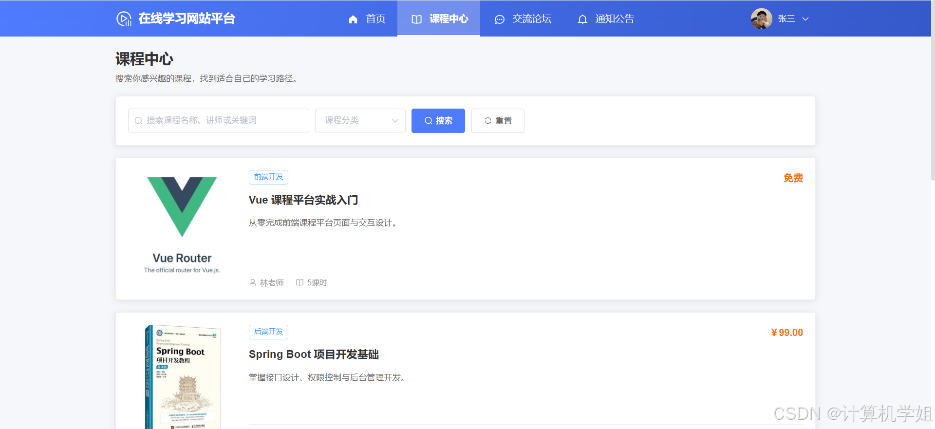 【2026最新】基于Java+SpringBoo+Vue+MySQL的在线学习网站平台,个性化推荐,热门推荐,数据可视化, 课程中心,章节学习,我的课程,课程分类管理,课程信息管理,章节管理,评论管理,课程订单管理,交流论坛管理等
