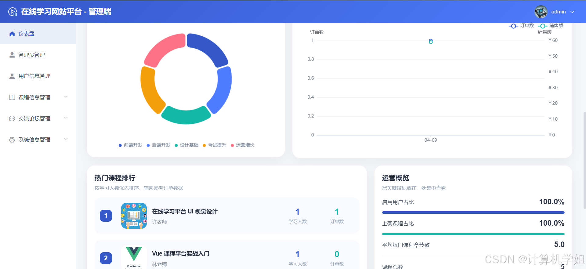 在数字化教育快速发展的背景下,传统在线学习平台普遍存在"信息过载"与"服务同质化"问题,用户难以从海量课程中快速定位符合自身需求的内容,教育机构也缺乏有效手段评估教学效果。本研究以提升在线学习效率与用户满意度为目标,通过整合个性化推荐、数据可视化与课程章节学习功能,构建一个以用户为中心的智能学习生态系统。个性化推荐技术能够根据用户学习行为、兴趣偏好等动态数据,实现课程资源的精准匹配,减少用户筛选成本,激发学习动力;数据可视化技术将抽象的学习数据转化为直观的图表,帮助用户清晰掌握学习进度,同时为教育机构提供教学效果分析工具,辅助优化课程设计与教学策略;课程章节学习模块通过结构化知识体系与交互式学习工具,支持用户按需学习、碎片化学习,提升知识吸收效率。此外,该平台采用SpringBoot+VUE+MYSQL的轻量级技术栈,降低了开发成本与维护难度,为中小教育机构提供可复制的技术方案。从教育公平视角看,平台通过降低优质教育资源的获取门槛,促进区域间教育资源共享;从产业发展视角看,平台为在线教育行业提供了"技术+服务"双轮驱动的创新模式,推动行业从规模扩张向质量提升转型,具有显著的社会价值与经济价值。
