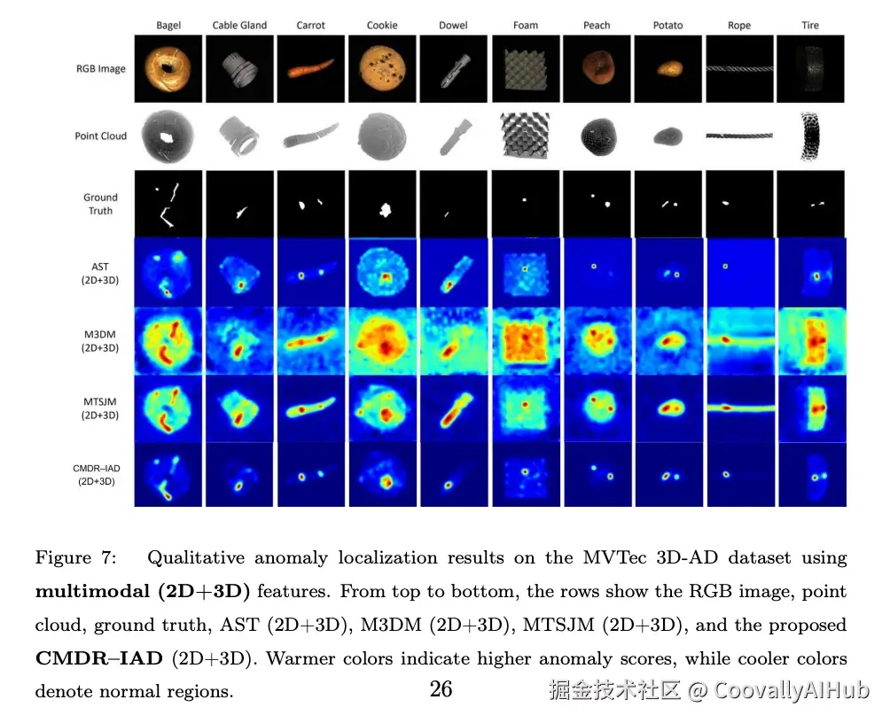 下表展示了2D+3D多模态设置下的I-AUROC结果,CMDR-IAD与16种对比方法的逐类别对比:
