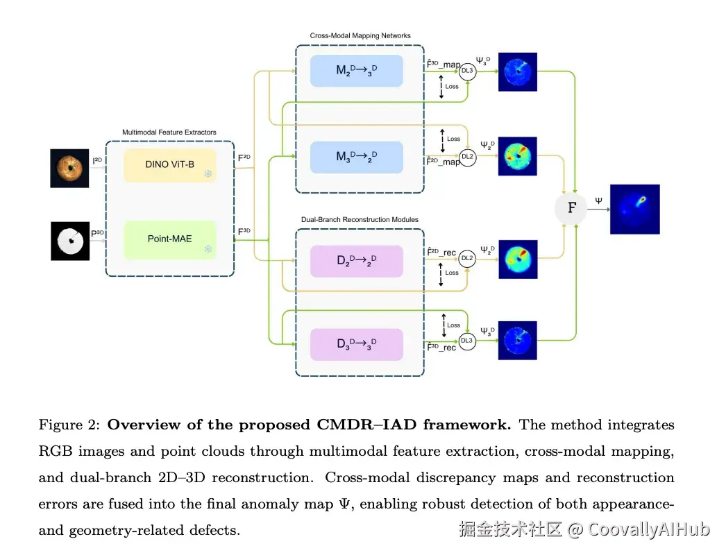这种设计的直觉是:在正常样本上,2D纹理与3D几何之间存在稳定的对应关系(比如,某种表面纹理通常对应特定的几何形状)。当出现异常时,这种对应关系被打破,映射预测与实际特征之间的差异就是异常信号。