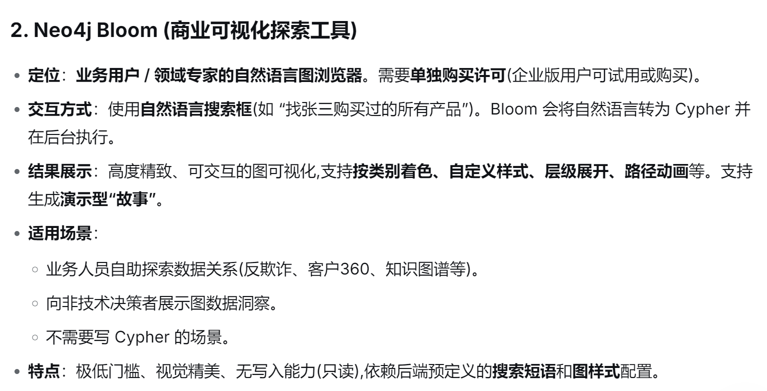 Bloom 是 Neo4j 的独立可视化产品,可通过商业许可进行访问。此工具是为业务分析人员和其它非开发人员设计的,无需编写任何代码即可与图数据库中存储的数据进行交互。