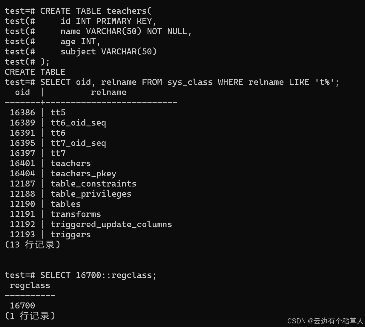 结合 regclass 可实现高效元数据查询:
