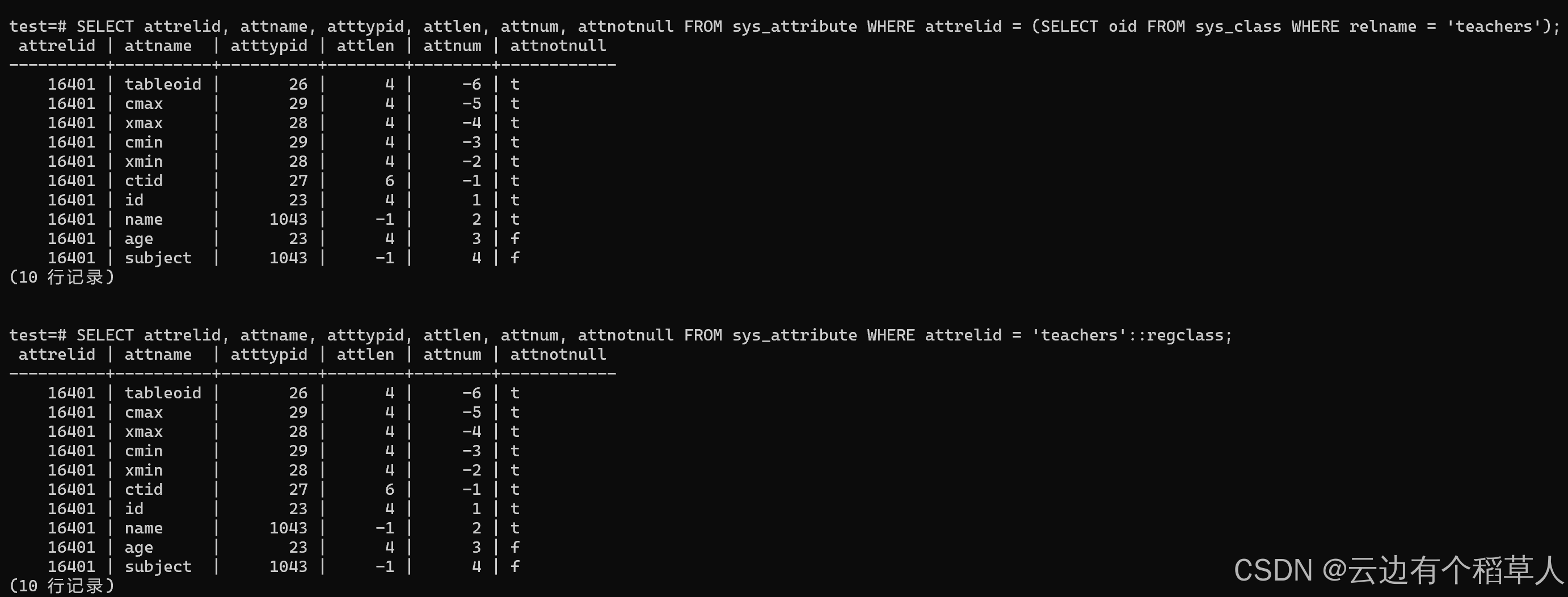 sys_attribute:表字段、系统隐藏字段(tableoid、ctid、xmin 等);