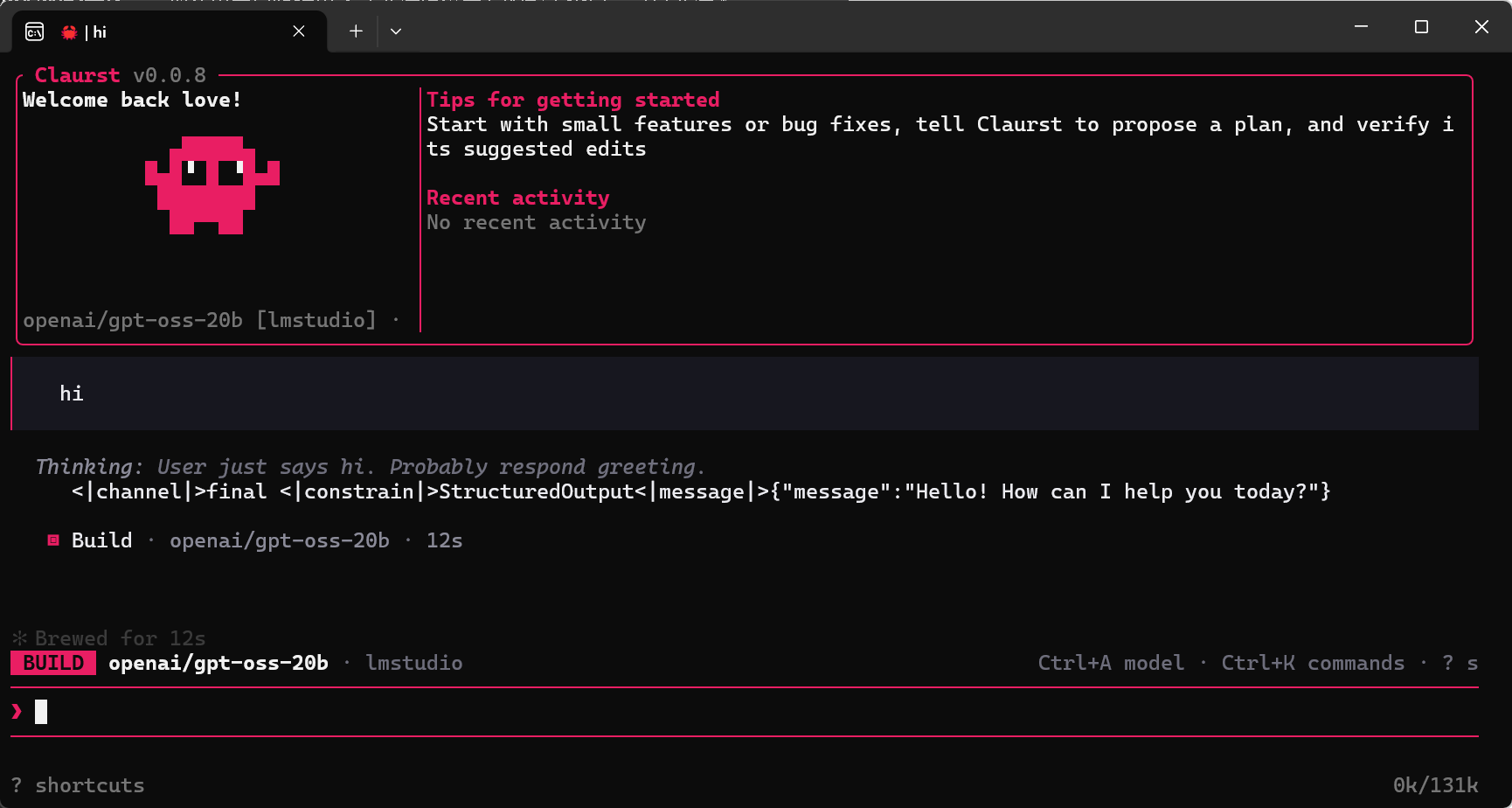 在 Claurst 主界面输入简单指令(如 hi 或 写一个 Python 快速排序函数),验证核心功能: