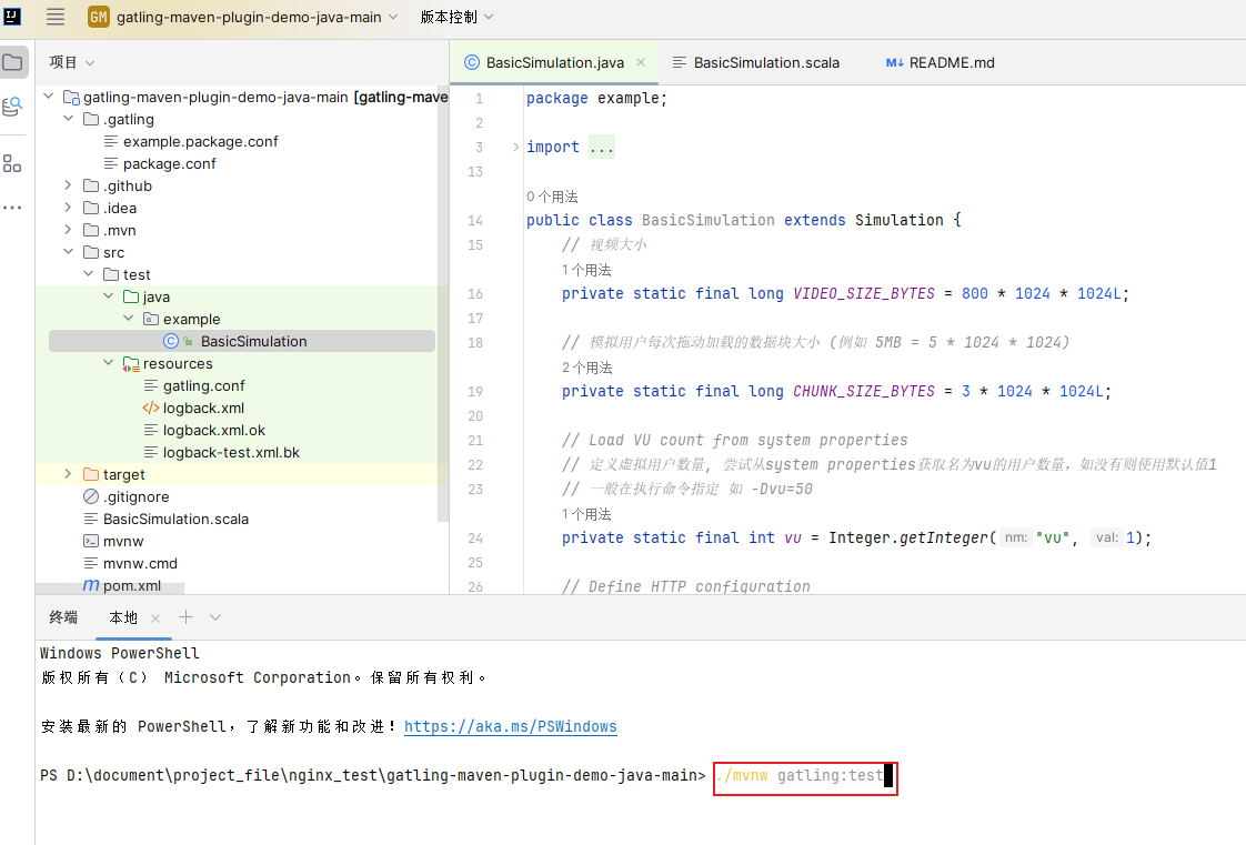如果是在cmd里面需要更改一下命令mvnw.cmd gatling:test