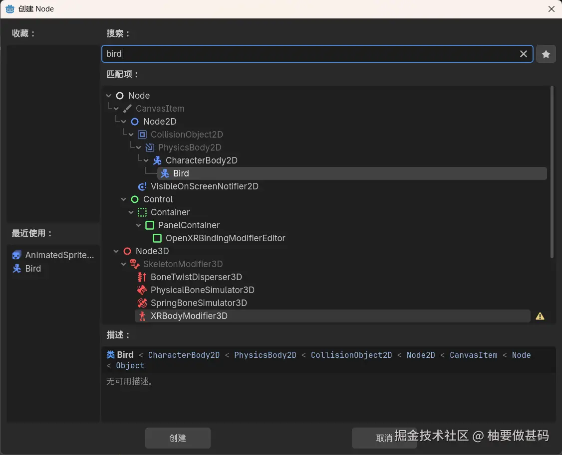 右键点击Bird,点击添加子节点 ,为你的Bird节点添加一个AnimatedSprite2D子节点,用这个节点来表示Bird的视觉效果。选中AnimatedSprite2D后在检查器 面板中的AnimatedSprite2D > Sprite Frames 中,新建SpriteFrames ,点击你刚刚创建的SpriteFrames,在编辑器的底部会出现动画面板。