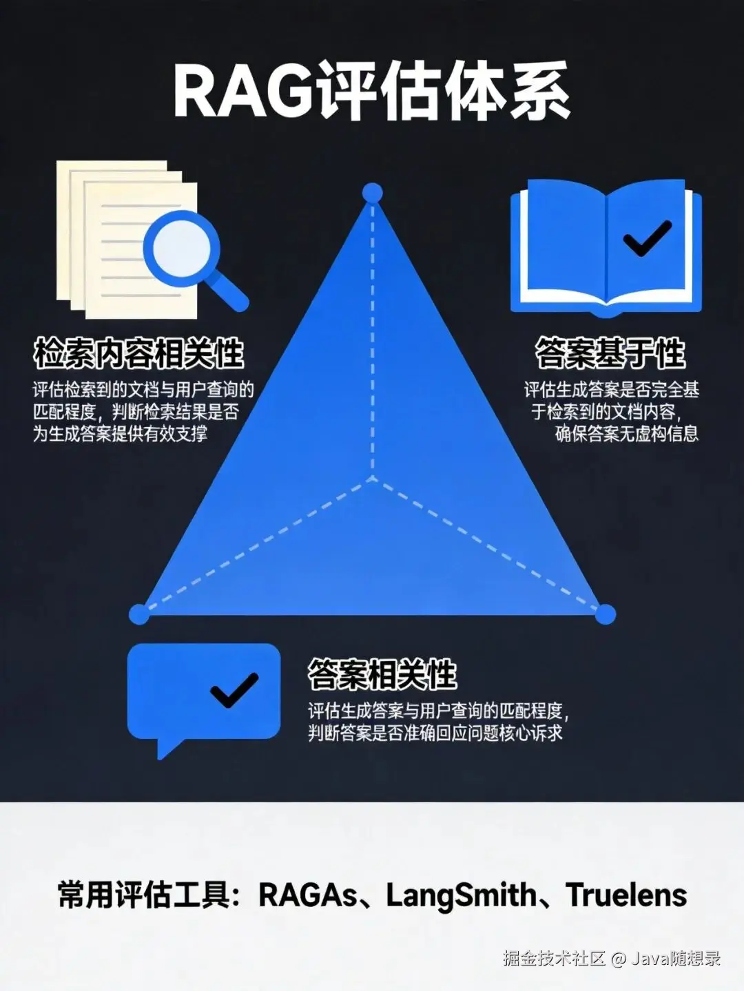 RAG 系统的质量评估是工程实践中的重要环节。业界通常采用 RAG 三元组 评估框架: