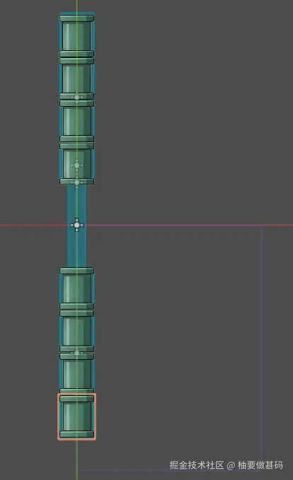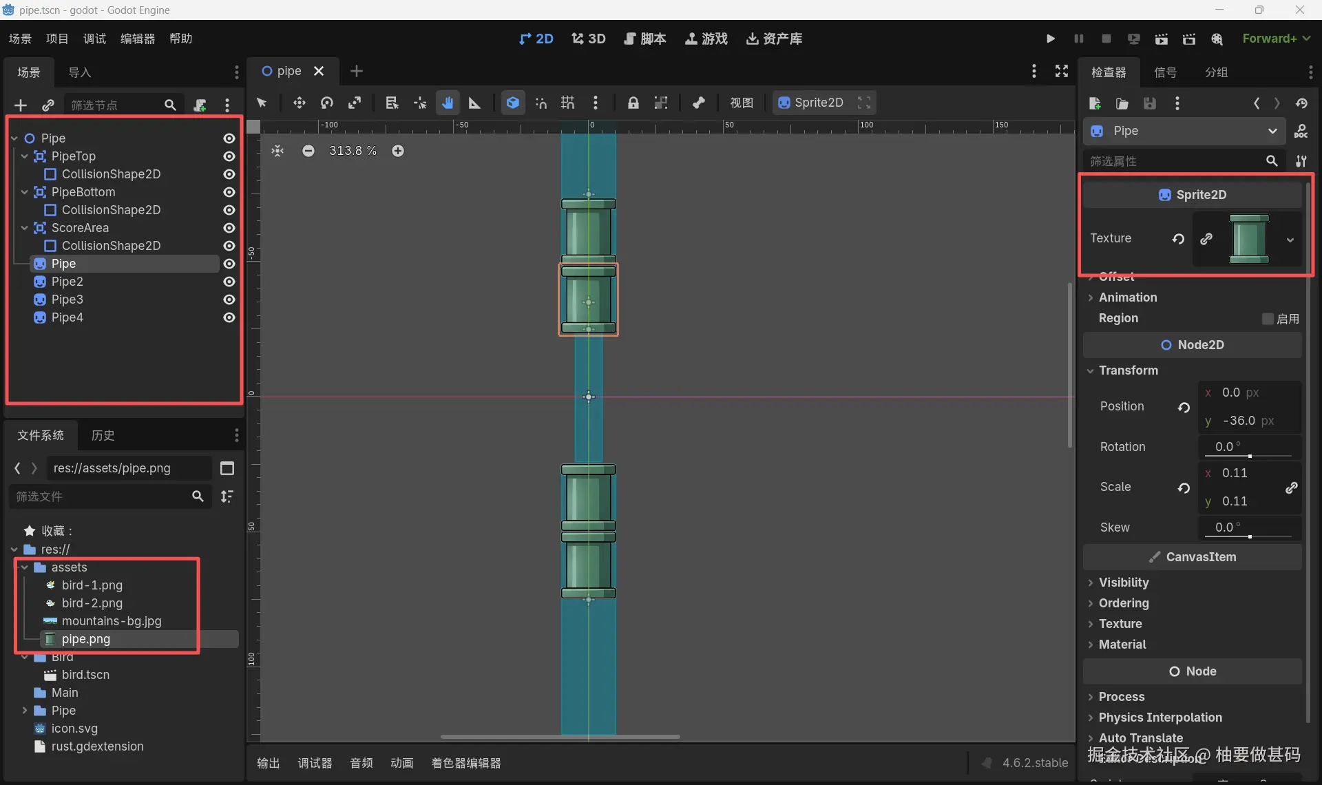 你一定有一个疑惑,这个Pipe到底需要多长?多大?原文没有详细写,这需要我们自己调整一下,回到godot 中,手动增加管道Sprite2D贴图的个数,使用鼠标和transform属性配合调整到合适的大小,这里我给一个图片作为参考
