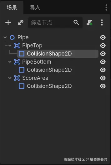 向Pipe节点添加三个子节点Area2D,分别命名为PipeTop、PipeBottom、ScoreArea,并向这三个子节点各添加一个CollisionShape2D子节点,并均用RectangleShape2D来表示CollisionShape2D的Shape。