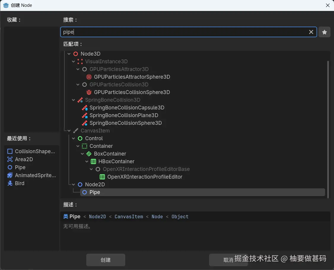 在godot中新建你刚刚创建的Pipe节点,并保存在你的Pipe文件夹下。