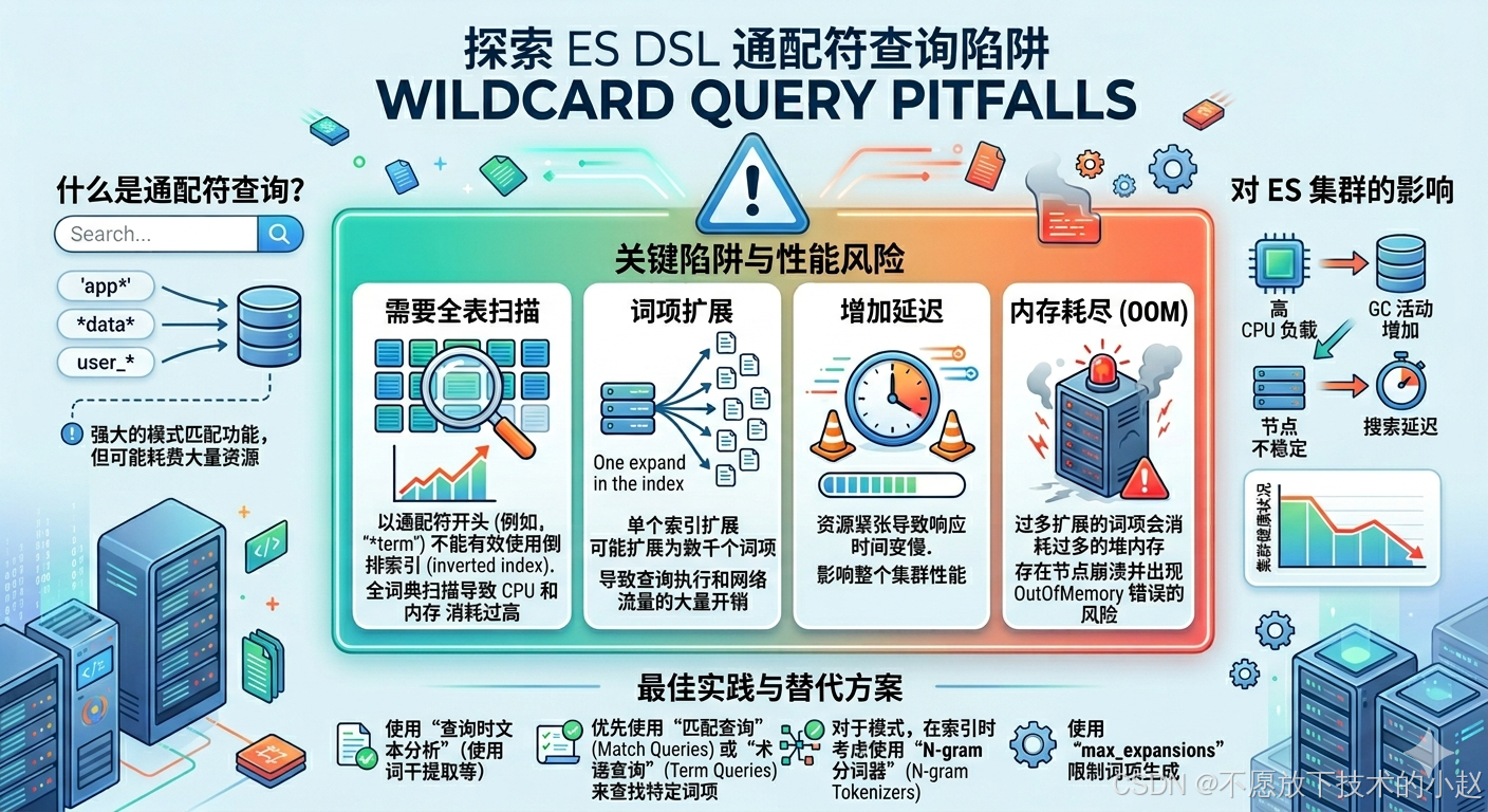 底层原理:Elasticsearch的倒排索引结构决定了通配符查询的性能问题: