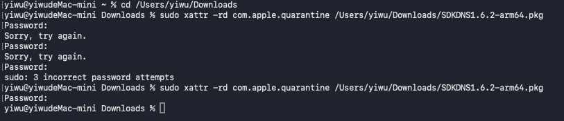 sudo xattr -rd com.apple.quarantine /Users/yiwu/Downloads/SDKDNS1.6.2-arm64.pkg