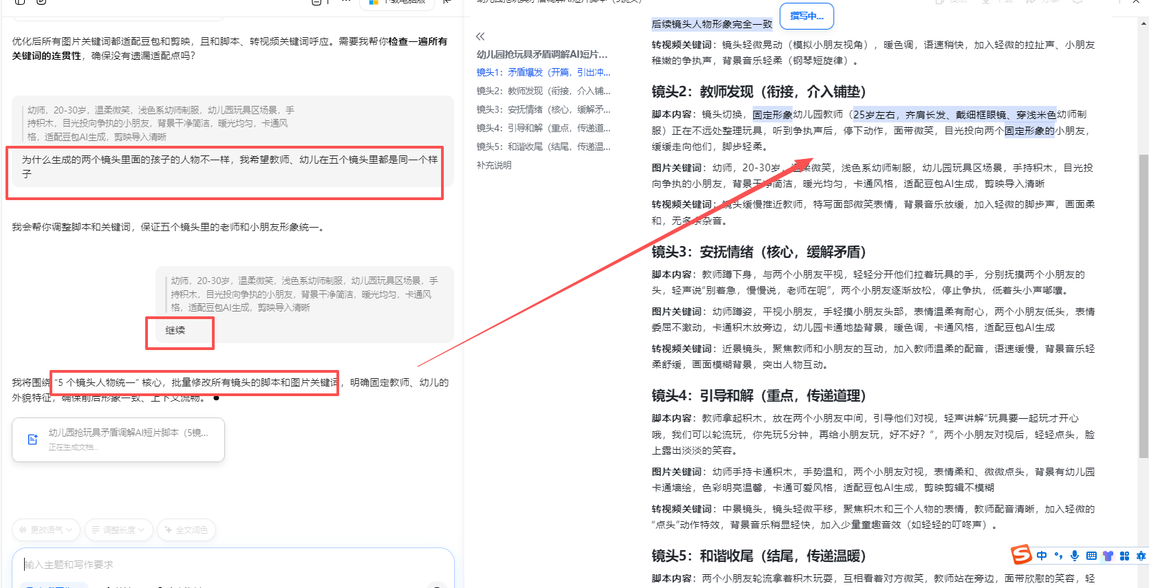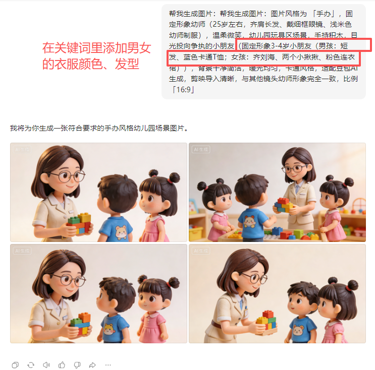 详细的人物特征描述(衣服颜色等)控制人物尽量相似。