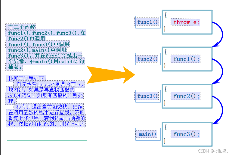 出现异常(无返回值...的概念)位置的后续代码不会执行(即当前函数的后面代码不会执行【对于前面函数的执行时向下执行,只有遇到return才会结束,结束后回到上一个调用它的函数。而这里抛异常,抛出一个对象来引发异常就是为了终止程序因为此时程序已经出问题了】),后续会和调用链中的catch中的类型进行匹配(即throw抛出的类型和catch中的类型进行匹配,走栈展开的过程【此过程中编译时进行】)