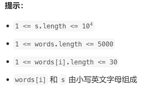 然后,从逆向分析,就是说我们要先把字符串数组 words 中的子字符串进行排列组合,得到一个新的子串集合,然后去找遍历 s 串中的每一个位置,看是否能匹配上我们新构建的子串集合里面的字符串。