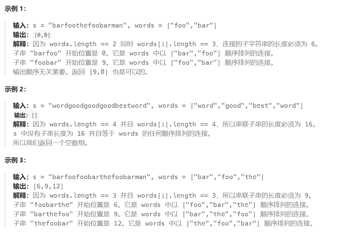 首先,从正向分析,这道题目的主要要求就是要在字符串 s 中找到一个子串,然后要找的这个子子串由字符串数组 words 演变而来,演变的方法就是把字符串数组 words 中的子的字符串进行排列组合。