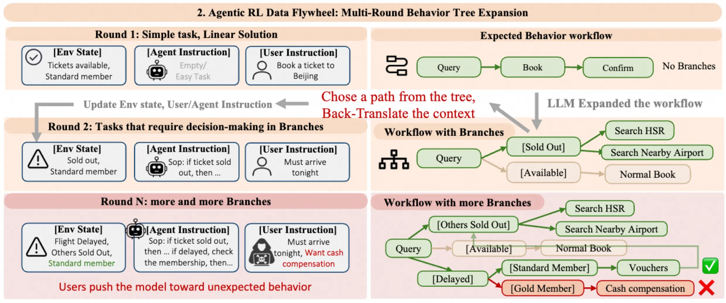 有了行为树之后,还需要把"分支"变成可训练的"任务",我们采用"back-translation(回译)"把某个分支变成"必经之路"。做法是:对行为树中选定的某条分支,先反推触发条件(例如触发"搜高铁"的条件是"航班全部售罄"),再据此构造一个新的任务实例:
