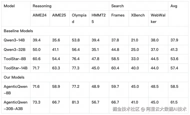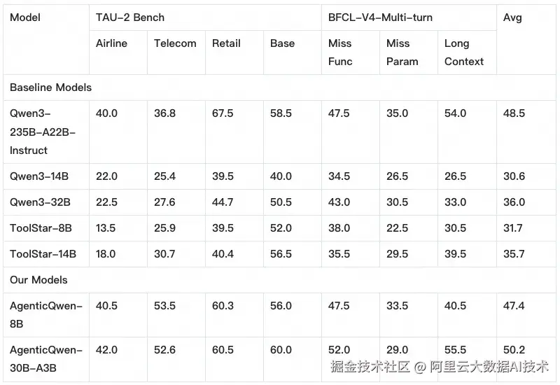下表进一步给出了本次开源的AgenticQwen 模型在 Agent 能力基准上的整体效果,并与原始 Qwen3 底座以及面向 Agent 场景的专用小模型 ToolStar-8B/14B 进行对比。整体结论是:在相近甚至更小的参数规模下,AgenticQwen 系列在多任务、多轮工具调用的综合指标上取得了更强的可用性,验证了"轨迹闭环训练"对 Agent 落地能力的高密度增益。