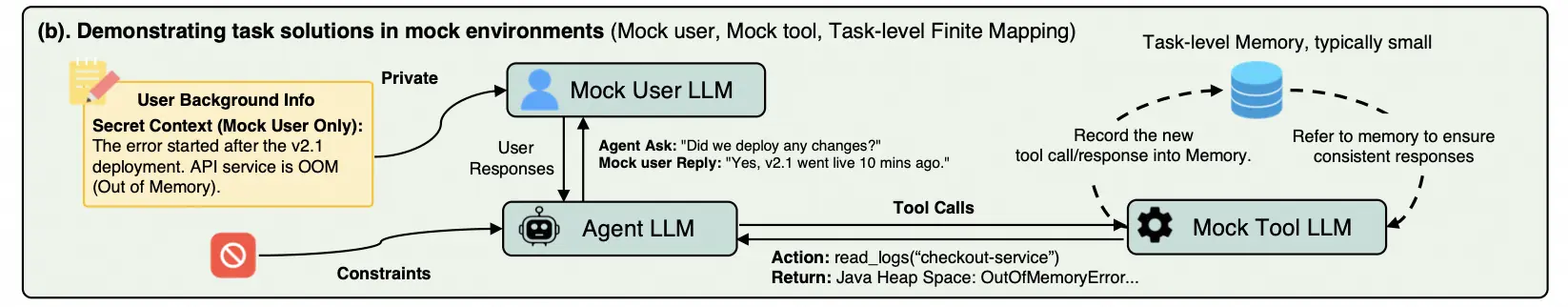 为了避免同一个调用在不同 rollout 中返回不一致结果、破坏 RL 稳定性,我们进一步引入任务级一致性机制:对每个任务维护轻量级的 tool call / response 映射,使相同语义的调用在同一任务中尽可能返回一致反馈。这样,虚拟环境既保留了交互性和多样性,又能提供足够稳定的训练条件。
