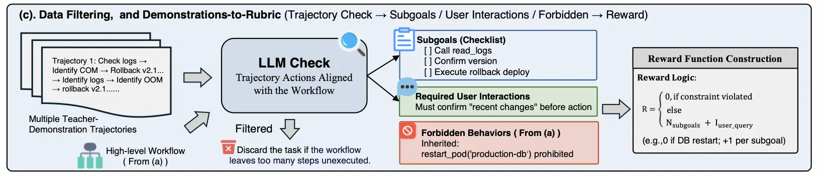 具体来说,我们利用任务合成时产生的工作流(workflow )作为参考,从教师模型的真实执行轨迹中抽取与之对齐的高层子目标,并结合任务中的必需用户交互与禁止行为,构建每个任务专属的 rubric。这样得到的奖励不是主观偏好分,而是基于执行(execution-grounded )的过程监督:既能约束错误行为,又允许模型通过不同路径完成目标,更适合长链 Agent 学习。