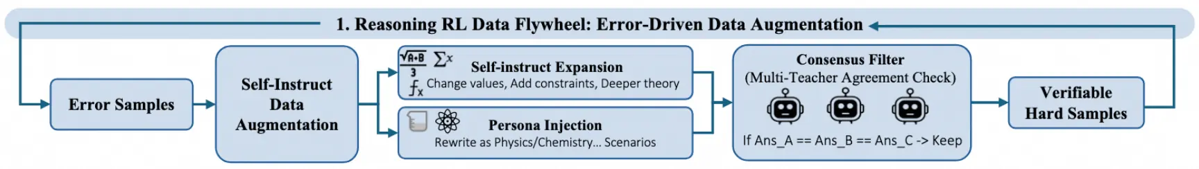 推理飞轮面向数学/科学类任务,每轮训练后收集模型做错的样本作为 hard samples,并进行三步扩增:
