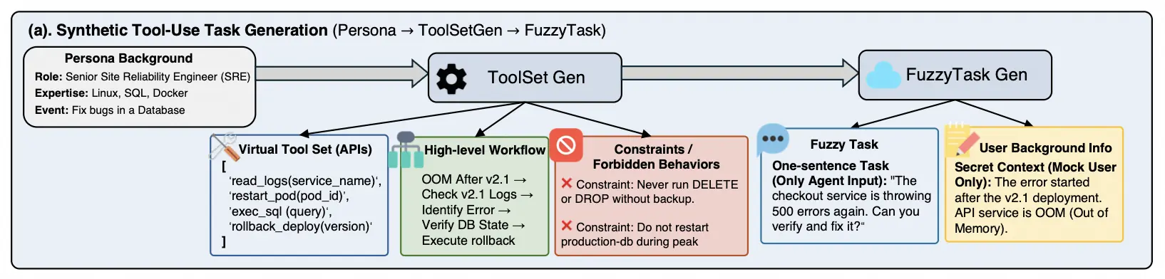 这样,模型无法从初始指令直接推出最优动作,而必须通过询问用户、调用工具、逐步恢复缺失信息来完成任务。这个设计生成了真正需要多轮交互、长期规划和动态决策的 Agent 问题。
