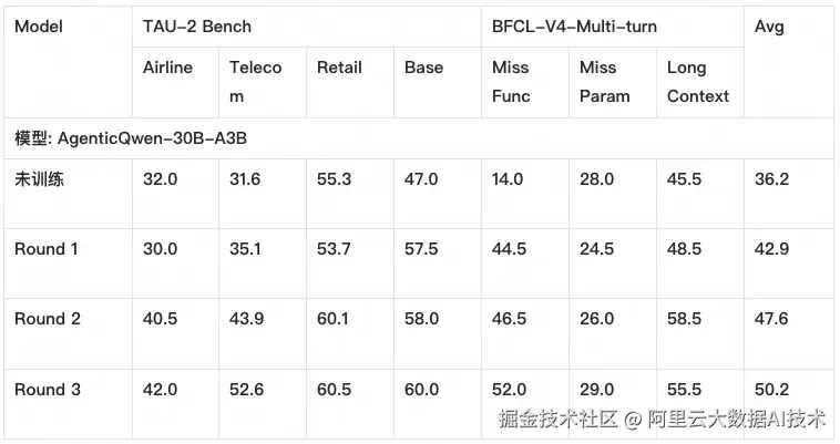 下表展示了 AgenticQwen-30B-A3B(以 Qwen3-30B-A3B 为底座)在多轮数据飞轮训练中,TAU-2 Bench 与 BFCL-V4-Multi-turn 两个 Agent 基准上的提升趋势。我们可以看到,随着轮次推进,模型不仅整体分数上升,也在如"漏工具(Miss Func)""漏参数(Miss Param)""长上下文(Long Context)"等更贴近真实落地痛点的子项上获得改进,体现出飞轮对"复杂流程鲁棒性"的持续强化。