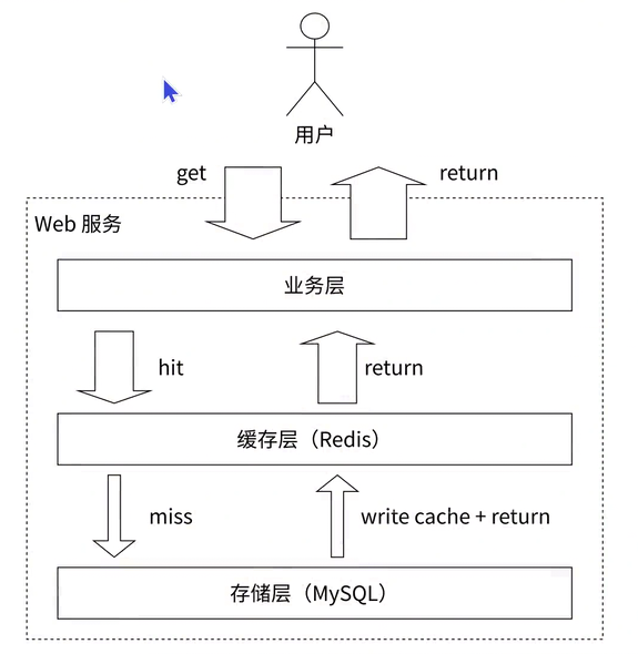 缓存(Cache)功能:这是 Redis 最经典的使用场景之一。在典型的架构中,Redis 会被部署为缓冲层,而 MySQL 等关系型数据库作为底层的存储层。系统在处理绝大部分数据请求时,都会优先尝试从 Redis 中获取数据。得益于 Redis 支撑高并发的特性,这种缓存层不仅能够极大地加速系统的数据读写速度,还能有效地降低后端数据库的访问压力。例如,业务中经常将用户的基本信息序列化后,以字符串的形式缓存到 Redis 中。