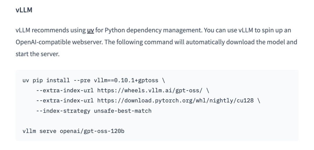 查看模型介绍:https://huggingface.co/openai/gpt-oss-120b ,模型的 README 中已说明需要安装 vLLM 0.10.1 gptoss 分支版本才能运行: