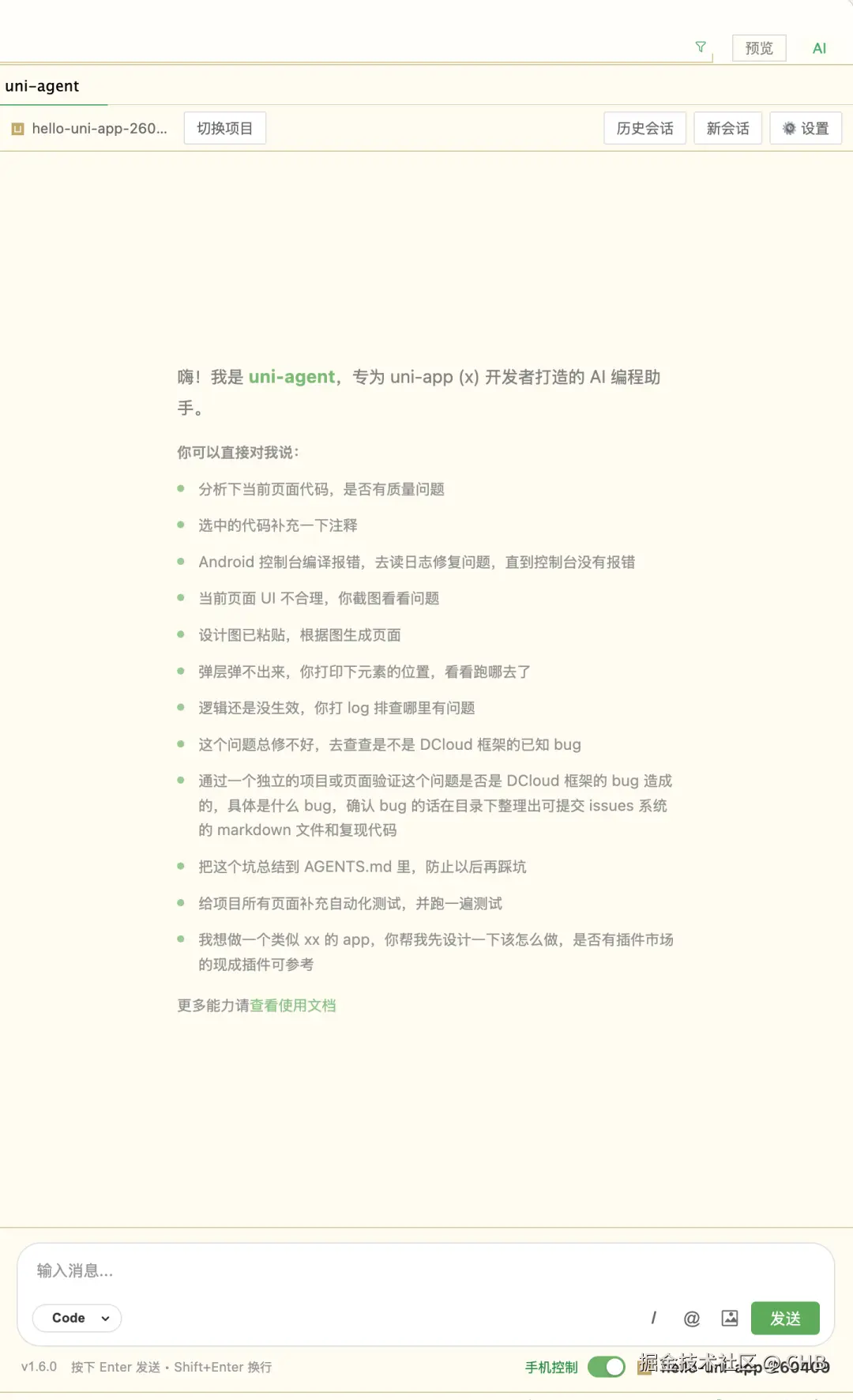 做 uni-app(x) 开发,没有比 uni-agent 更懂你项目的 AI。 这是其他AI工具给不了的。