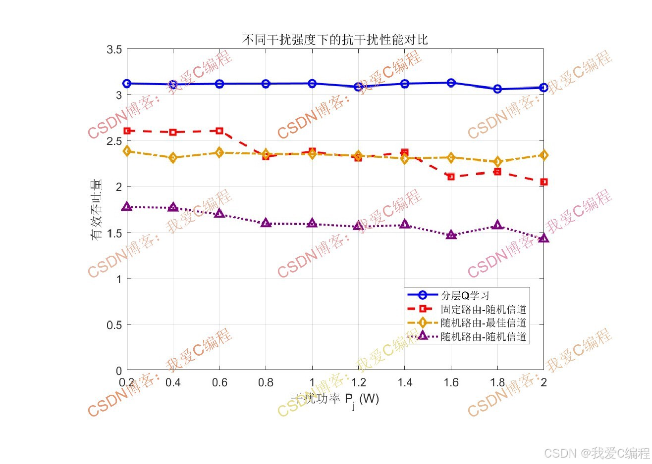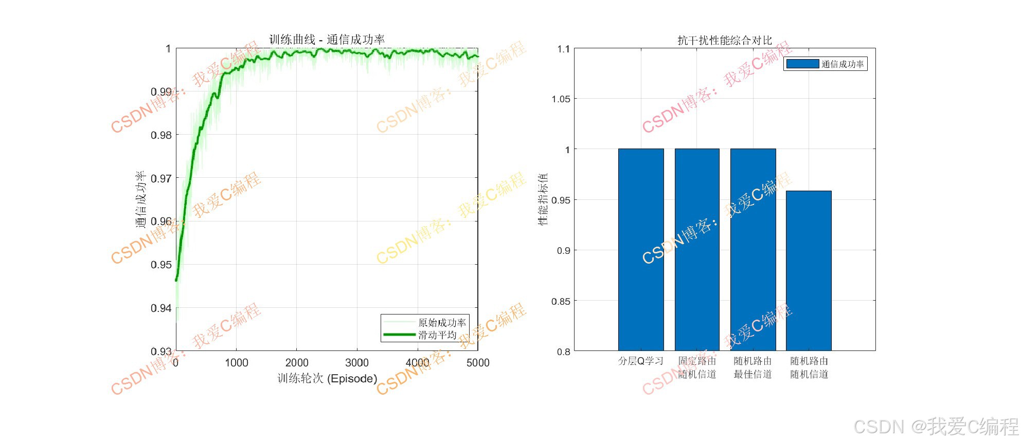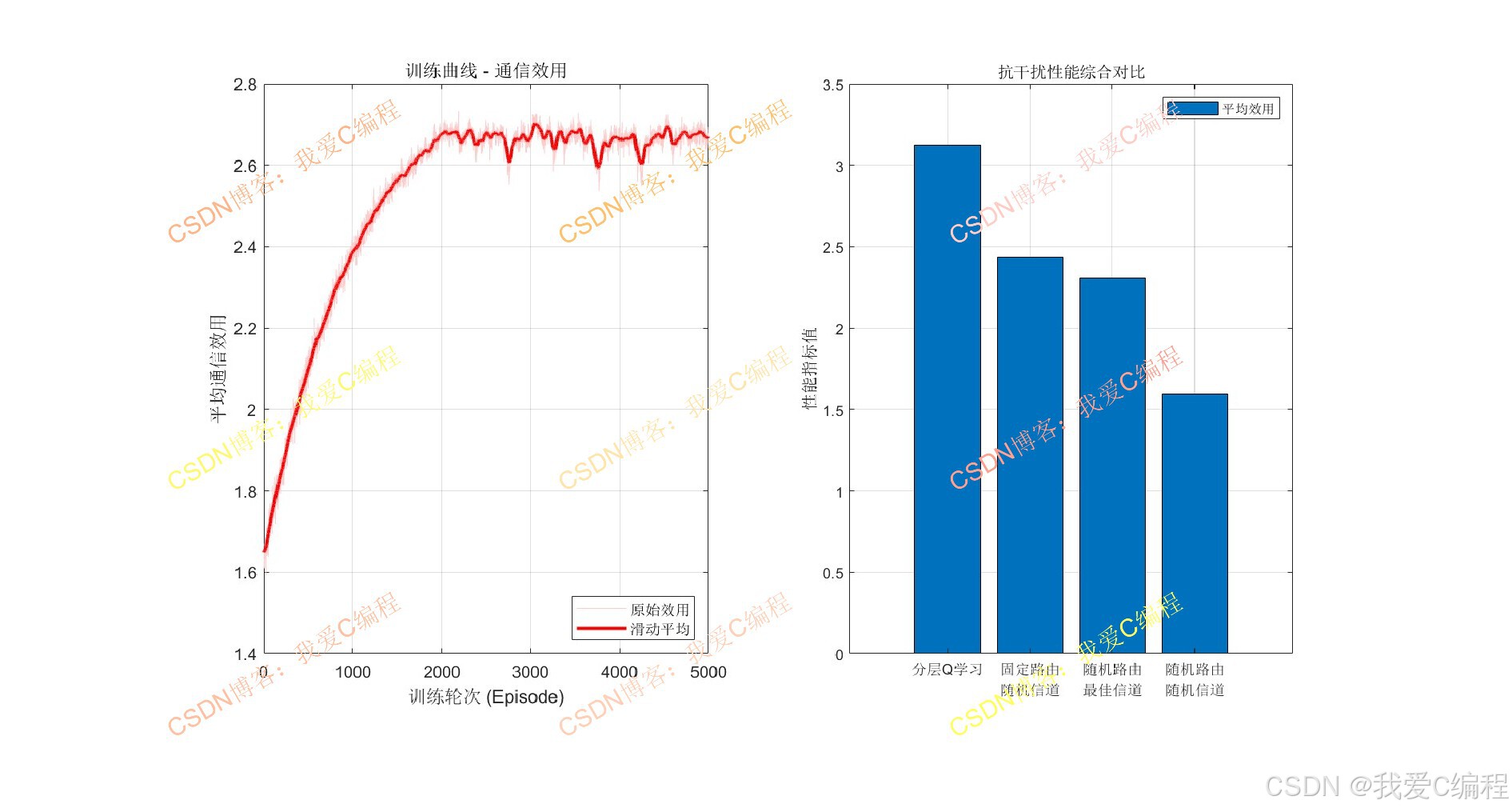 上层Q学习(路由选择):维护Q表𝑄route(𝑠,𝑟),其中状态𝑠包含网络负载、历史干扰信息等,动作𝑟为路由选择。其更新规则为:
