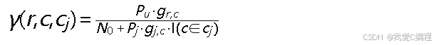 其中𝑃𝑢为用户发射功率,𝑔𝑟,𝑐为路由 𝑟上信道 𝑐的信道增益,𝑁0为噪声功率,𝑃𝑗为干扰功率,𝑔𝑗,𝑐为干扰信道增益,𝐼(⋅)为指示函数。