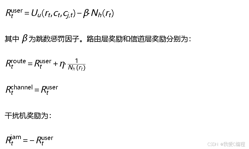用户信干噪比(SINR):当用户选择路由 𝑟和信道 𝑐,干扰机选择干扰信道集合 𝑐𝑗时,用户在各跳链路上的信干噪比为: