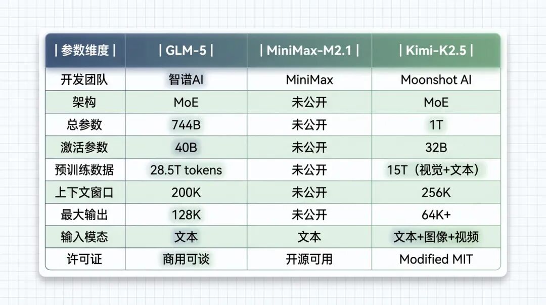 | 参数维度 | GLM-5 | MiniMax-M2.1 | Kimi-K2.5 |