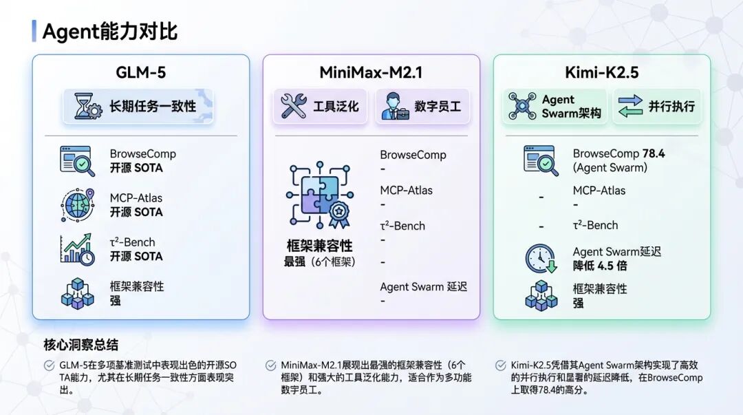 如果你的场景是单代理长程任务 (比如持续监控、日志分析),GLM-5 的目标一致性更强;如果需要跨框架迁移 (比如先在 Claude Code 测试,再迁移到 Cline),MiniMax-M2.1 的兼容性最好;如果任务是高并发复杂任务(比如同时处理多个用户的请求),Kimi-K2.5 的 Agent Swarm 架构会更有优势。