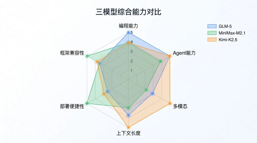 如果你的场景是全栈 Web/App 开发 ,MiniMax-M2.1 的 VIBE 数据很亮眼;如果重点是后端重构和长期维护 ,GLM-5 的 SWE-bench 表现更稳;如果经常需要从设计稿生成代码,Kimi-K2.5 的视觉编程能力会是加分项。