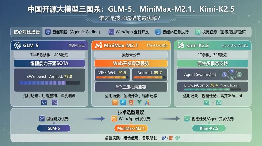 GLM-5 说自己编程能力对标 Claude Opus 4.5;MiniMax-M2.1 拿出 VIBE Benchmark 数据,Web 开发 91.5 分;Kimi-K2.5 则强调原生多模态和 Agent Swarm 架构。
