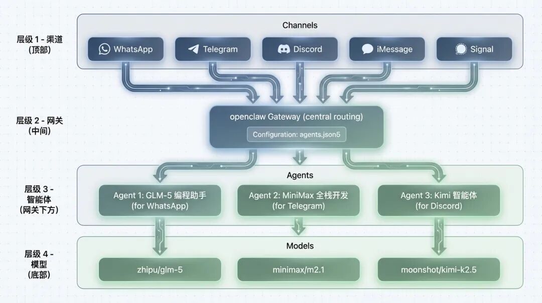 openclaw 支持配置多个隔离的代理,每个代理可以使用不同的模型:{ agents: { list: [ { id: "glm5-coding", name: "GLM-5 编程助手", workspace: "~/.openclaw/workspace-glm5", model: "zhipu/glm-5", }, { id: "minimax-fullstack", name: "MiniMax 全栈开发", workspace: "~/.openclaw/workspace-minimax", model: "minimax/m2.1", }, { id: "kimi-agent", name: "Kimi 智能体", workspace: "~/.openclaw/workspace-kimi", model: "moonshot/kimi-k2.5", }, ], }, bindings: [ // WhatsApp 用 GLM-5 处理编程问题 { agentId: "glm5-coding", match: { channel: "whatsapp" } }, // Telegram 用 MiniMax 处理全栈开发 { agentId: "minimax-fullstack", match: { channel: "telegram" } }, // Discord 用 Kimi 处理复杂任务 { agentId: "kimi-agent", match: { channel: "discord" } }, ], }