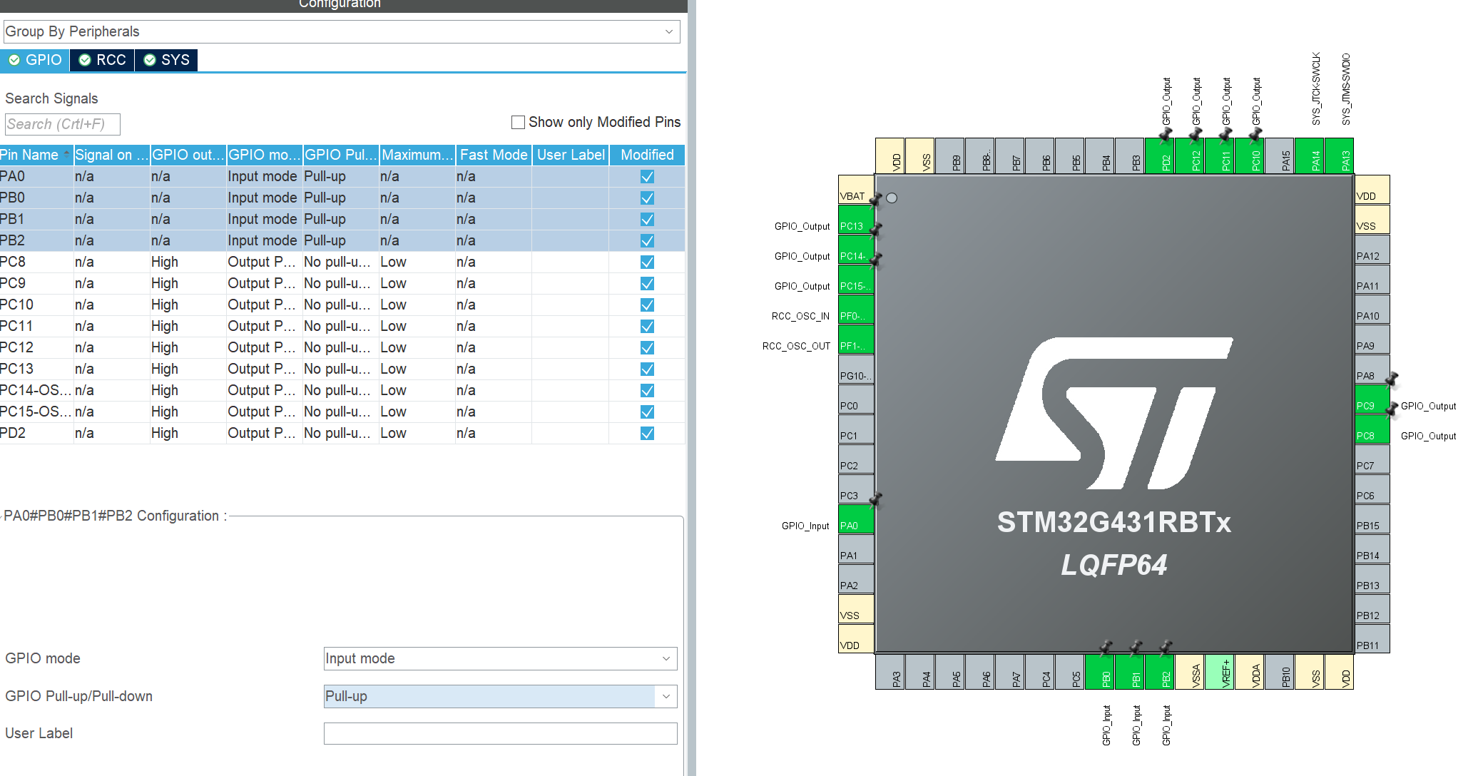 原理图可知按键按下为低电平,CubeMX中配置为input,和pull-up默认上拉电阻高电平。